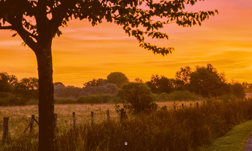 Een prachtige zonsondergang over de weilanden met een palet van oranje, roze en paars.